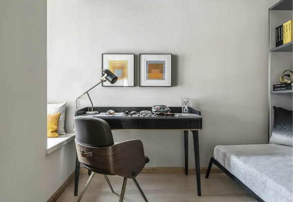 餐厅里安装上一面金属装饰,将客厅空间也映入其中,宽厚平整的表面,显得大气尊贵。一套铁艺极简餐桌,沉稳的胡桃木靠背,大理石的餐桌面,摆上一套精美的餐具,加以果盘、花瓶装饰,营造了玉溪城市林语餐厅精致高级的用餐仪式感,餐厅隔壁还专门设计了一间独立的书房,飘窗的造型,俘获人心,一套黑色的书桌椅,内敛稳重,配上一盏探照灯造型的LED台灯,为工作学习提供有力健康保护。墙上挂上矩形线条的挂画,书房里还放置了一张单人小床,以备家里有留宿的客人,平时工作很晚不想回卧室打扰家人休息的话也可以在书房里休息。
